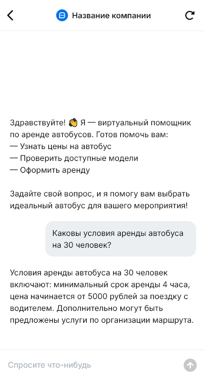 Аренда автобуса оформляется быстрее когда бот уточняет маршрут и пассажиров и сразу предлагает подходящий класс транспорта