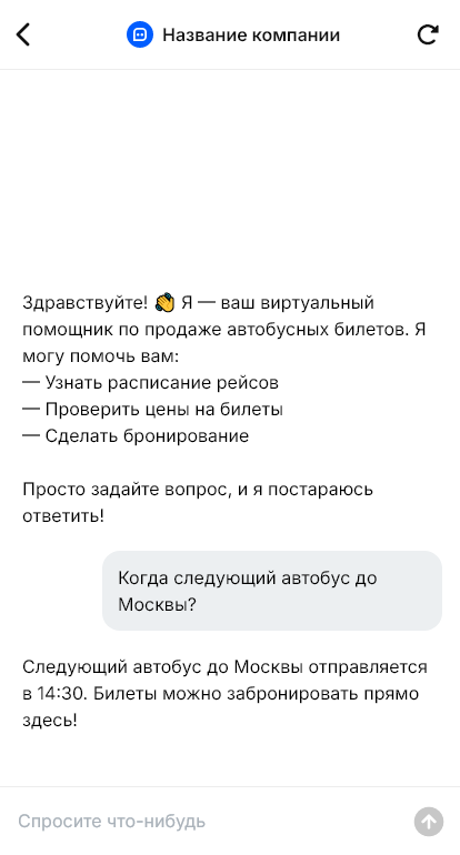 Продажа автобусных билетов часто связана с срочными решениями. Пассажир хочет быстро узнать, есть ли рейсы, сколько стоит, сколько времени в пути, где посадка, есть ли багаж и пересадки, можно ли вернуть билет. Если нужно звонить или искать на сайте, часть клиентов теряется, особенно когда человек уже в дороге. При этом у перевозчиков и касс есть типовые вопросы, которые повторяются десятки раз в день.