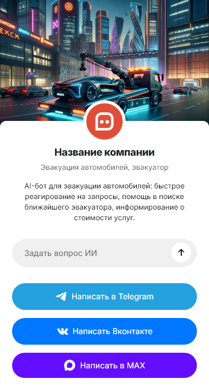 Внедрение настраивается под вашу службу: парк эвакуаторов, тарифы, зоны, доплаты, интеграция с диспетчеризацией и CRM, статусы и уведомления. Бот может сообщать ETA, контакт водителя, инструкции по ожиданию и безопасности на дороге. Для постоянных клиентов и партнёров (СТО, страховые) бот помогает оформлять заявки быстрее и хранить типовые адреса.