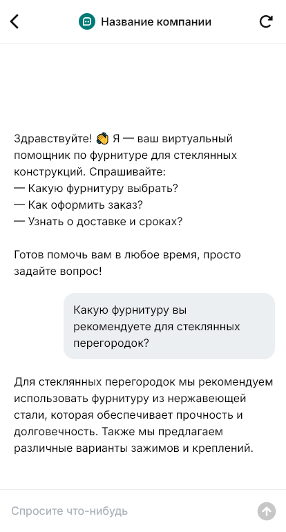 В сопровождении бот держит поставку и помогает монтажникам. Он сообщает статусы, счет, комплектация, отгрузка, и хранит инструкции по установке. Если на объекте возникает вопрос, не подходит крепеж, нужна замена или не хватает элемента, бот быстро принимает обращение, просит фото и маркировку и помогает подобрать аналог без остановки работ. В итоге проекты со стеклом собираются быстрее и без сюрпризов, потому что бот фиксирует параметры, проверяет совместимость и держит всю коммуникацию в одном месте.