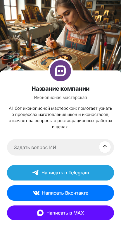 Внедрение настраивается под мастерскую: каталог образов, ориентиры по срокам, этапы работы (эскиз, согласование, написание, покрытие), условия предоплаты, доставка и упаковка, интеграция с CRM. Бот фиксирует заявку аккуратно и структурированно, чтобы мастер понимал все нюансы и мог дать точную оценку.