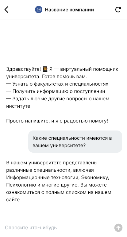 Институт и университет — это сложная система программ, правил поступления, дат и требований. Абитуриенты и их родители задают десятки вопросов: какие направления есть, какие проходные баллы, какие экзамены, какие документы нужны, есть ли общежитие, как подать заявление, какие сроки приёма, есть ли платное/бюджет. В сезон приёмной кампании нагрузка на приёмную комиссию огромная, а абитуриенты хотят быстрых и точных ответов.