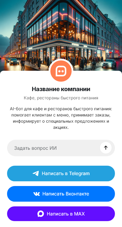 В итоге формат быстрого питания получает больше заказов без расширения штата. Бот работает в Telegram, VK, MAX и на сайте, превращая вопросы о меню в оформленные покупки и стабильную выручку.