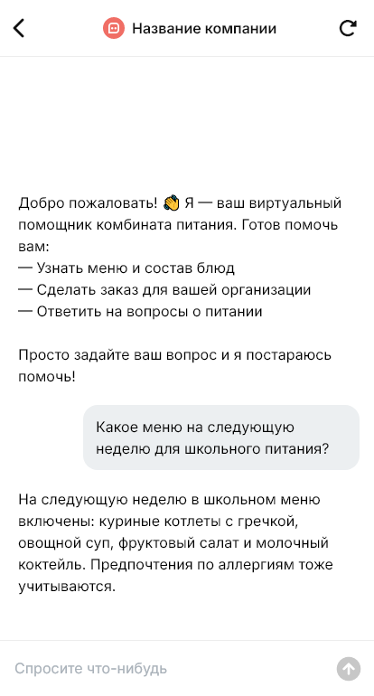В итоге комбинат питания работает предсказуемее, меньше ошибок по заказам и документам, выше качество сервиса, потому что бот фиксирует параметры и сопровождает клиента на каждом этапе.