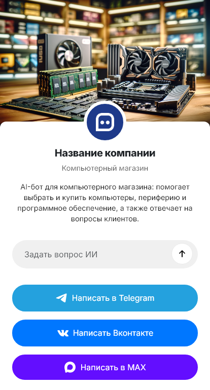 Чат-бот уточняет задачу и бюджет, предлагает подходящие конфигурации, помогает подобрать комплектующие и аксессуары, отвечает по доставке и гарантиям, собирает контакты и передаёт заявку специалисту. Для частых сценариев бот может направлять к готовым сборкам и акциям.