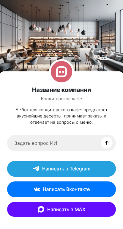В итоге кондитерское кафе получает больше бронирований и заказов на вынос. Бот работает в Telegram, VK, MAX и на сайте, превращая вопросы о витрине в визиты и покупки.