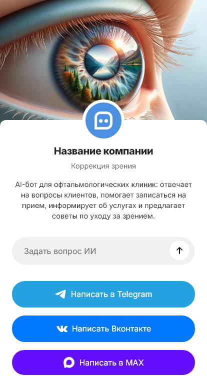 В итоге растёт конверсия обращений в визиты и уменьшается количество потерянных заявок. Бот работает в Telegram, VK, MAX и на сайте, превращая вопросы о коррекции зрения в подтверждённую запись на диагностику.