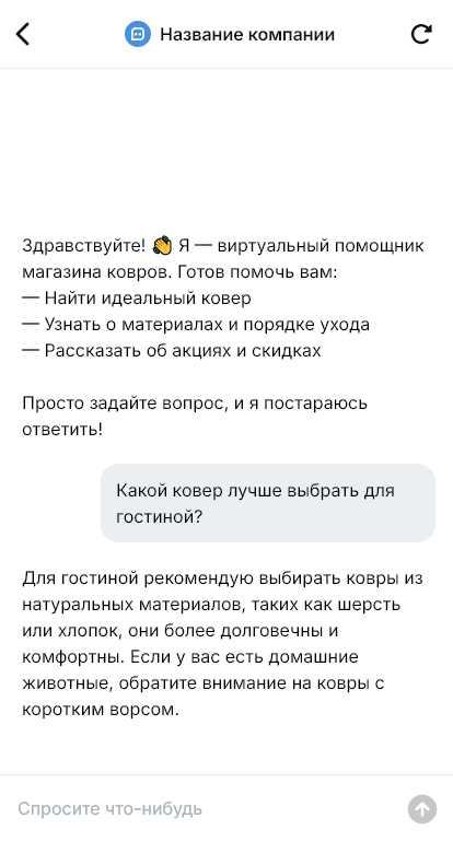 Такой подход делает продажи ковров более стабильными: меньше брошенных диалогов, больше обращений, дошедших до покупки. Клиент получает быстрые и полезные ответы, а команда разгружается от рутинных вопросов и подключается там, где требуется финальная консультация или нестандартный заказ.