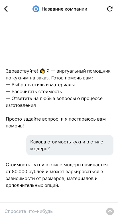 Внедрение настраивается под конкретную компанию: бренды материалов и фурнитуры, варианты столешниц, сроки производства, процесс проектирования, условия оплаты, доставка и монтаж, гарантийное обслуживание. Поэтому бот ведёт клиента по реальному маршруту и снижает риск недопонимания, когда ожидания по цене и срокам расходятся.