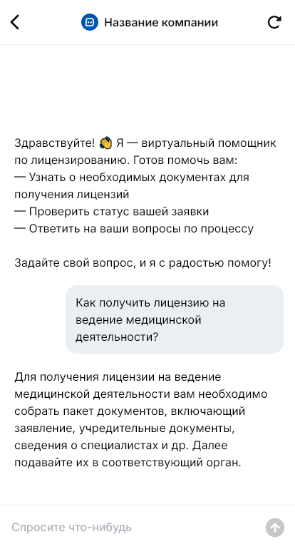 Внедрение настраивается под практику компании: виды лицензий, перечни документов, этапы сопровождения, сроки, стоимость, требования к договору и взаимодействию с госорганами. Бот помогает фиксировать заявки и передавать специалисту структурированную информацию, чтобы тот сразу понимал ситуацию.