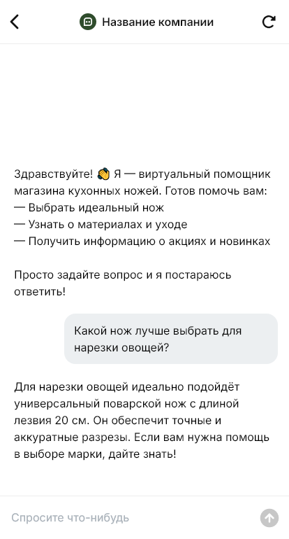 В результате магазин получает больше завершённых заказов из переписки и меньше «висящих диалогов». А покупатель чувствует, что ему не просто продали товар, а помогли подобрать инструмент под его кухню и стиль готовки.