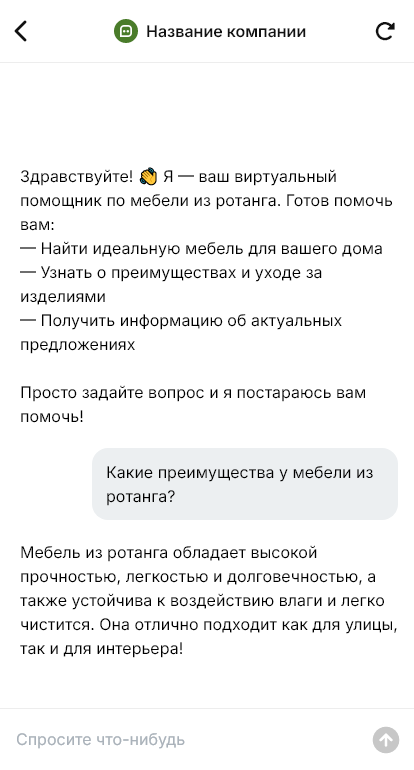 Бот для мебели из ротанга помогает быстро собрать запрос и предложить подходящий комплект. Он уточняет место использования, желаемую компоновку (диван, кресла, стол, шезлонги, подвесное кресло), количество посадочных мест, предпочтения по цвету плетения и подушек, бюджет и сроки. Бот может объяснить разницу между натуральным и искусственным ротангом, подсказать, какие модели лучше для открытого воздуха, а какие — для закрытых помещений, и как ухаживать за комплектом.