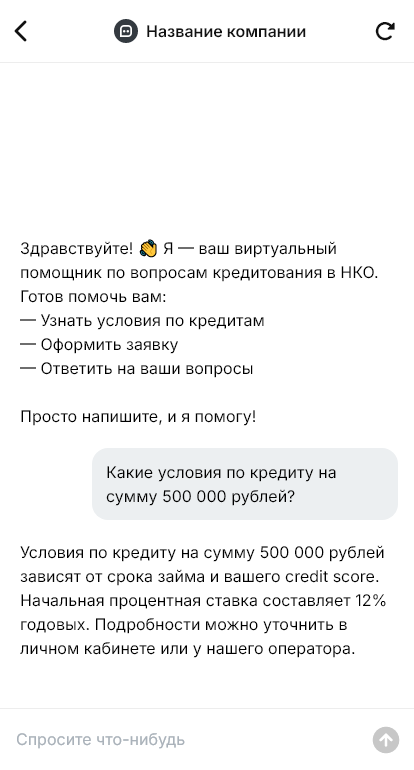 Чат-бот уточняет базовые параметры запроса (сумма, срок, цель), помогает подготовить список документов, собирает контакты и передаёт заявку специалисту. Все обращения фиксируются, поэтому ничего не теряется даже при высокой нагрузке. При этом бот корректно сообщает, что решение принимается по внутренним правилам и может требовать проверок.