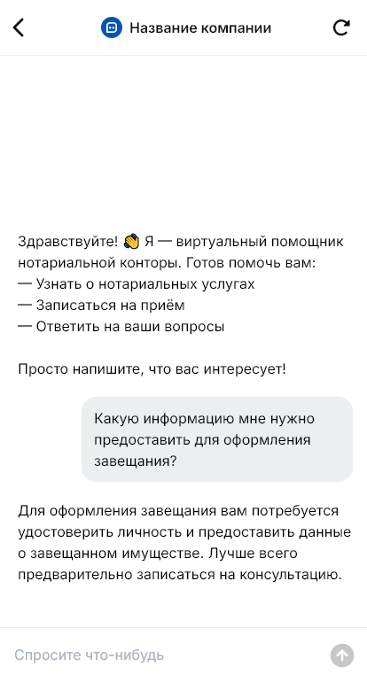 Нотариальные действия проходят быстрее, когда бот уточняет ситуацию и подготавливает список документов