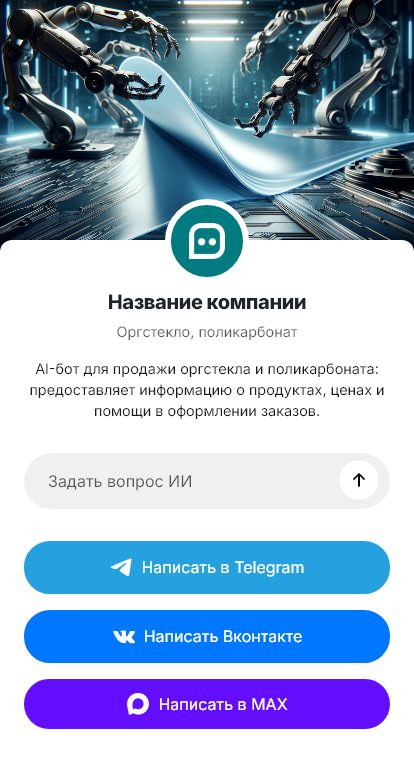 Чат-бот уточняет применение, требования к прочности и прозрачности, размеры, толщину, цвет, количество листов, необходимость резки по чертежу, сверления, гибки или комплектующих. Затем бот предлагает подходящие варианты материалов, даёт ориентир по стоимости и срокам изготовления/отгрузки, показывает технические характеристики и отвечает на типовые вопросы по монтажу и эксплуатации.