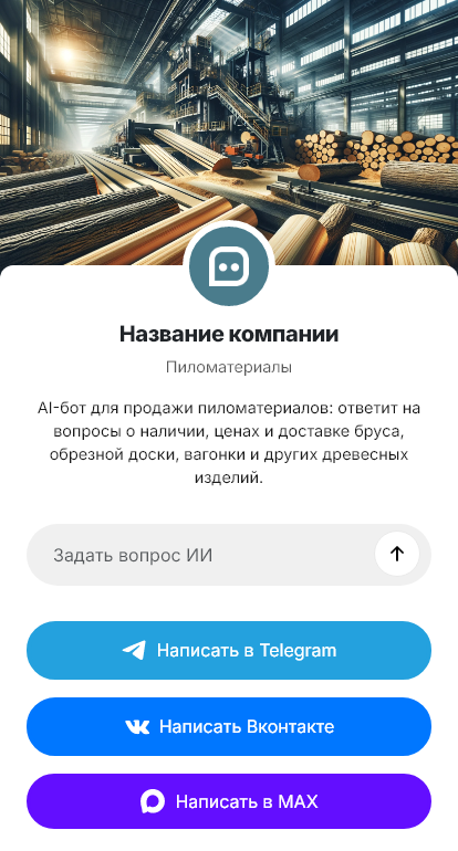 Бот для продажи пиломатериалов помогает собрать точные параметры заказа. Он уточняет назначение (каркас, отделка, опалубка, терраса), породу древесины, сорт, влажность, размеры и длины, объём в кубах, необходимость строгания, антисептирования, распила, сроки и адрес доставки. Бот фиксирует контакт и может сформировать заявку на счёт.