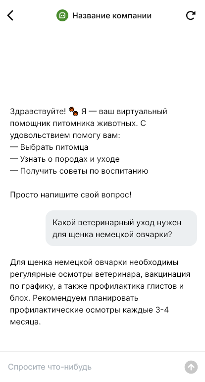 Чат-бот показывает доступные помёты или ближайшие планы, рассказывает об условиях покупки, документах и правилах, отвечает на типовые вопросы. Далее бот задаёт вопросы потенциальному владельцу: опыт, условия содержания, планы по стерилизации/разведению (если актуально), готовность к уходу, и собирает контакты. По итогам бот передаёт заявку заводчику уже с заполненной анкетой.