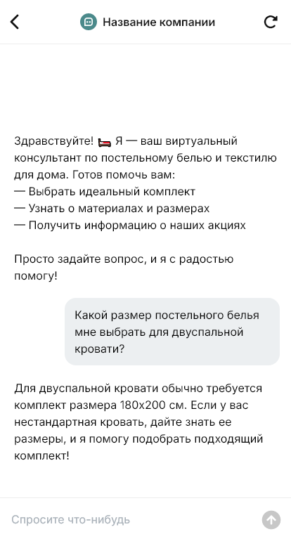 В итоге повышается конверсия и снижается количество брошенных диалогов: клиент получает быстрый ответ и уверенность в выборе, а магазин — оформленные заказы и больше продаж комплектами: бельё + покрывало + плед + декоративные наволочки.