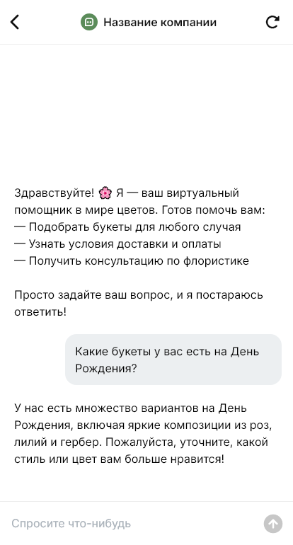 В результате цветочный магазин получает больше заказов из входящих сообщений и меньше теряет клиентов из-за задержек ответа. Клиенту удобно выбрать и оформить подарок, а вы повышаете средний чек за счёт допродаж: открытки, упаковка, сладости, шарики и дополнительные композиции.