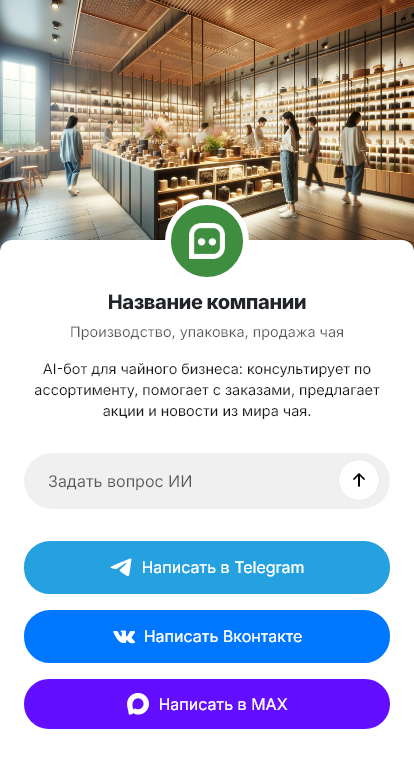 В итоге чай продаётся стабильнее, а коммуникация становится проще и приятнее. Бот работает в Telegram, VK, MAX и на сайте, превращая вопросы о сортах в оформленные заказы и лояльность к бренду.