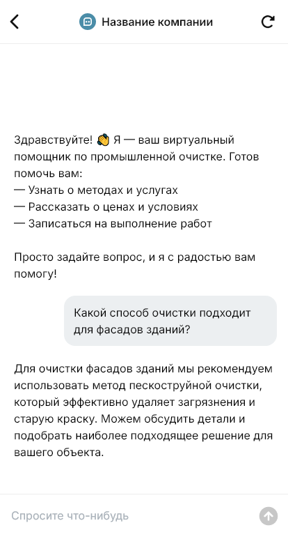 В итоге промышленная очистка продаётся быстрее и безопаснее. Бот работает в Telegram, VK, MAX и на сайте, повышает качество заявок, ускоряет выбор технологии и помогает довести клиента от первого обращения до закрытия проекта и следующего планового обслуживания.