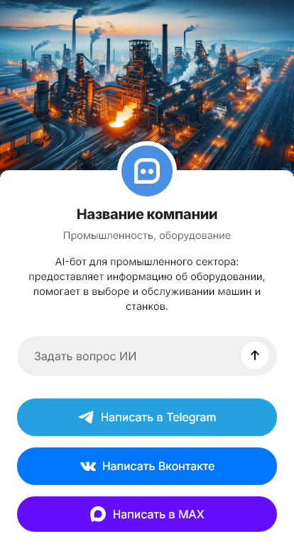 Внедрение настраивается под вашу компанию: категории оборудования, типовые вопросы, интеграция с CRM, этапы согласования и уведомления. Бот может объяснять процесс: анализ требований → подбор → КП → согласование → поставка → пусконаладка → обучение → сервис. Для существующих клиентов бот помогает с поддержкой: заявки на сервис, заказ запчастей, плановое обслуживание.