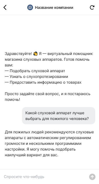 Чат-бот объясняет порядок подбора и настройки, уточняет потребности и бюджет, предлагает запись на диагностику, собирает контакты и передаёт заявку специалисту. Бот может информировать о гарантийном обслуживании и расходниках, не заменяя медицинскую консультацию и направляя к врачу при необходимости.