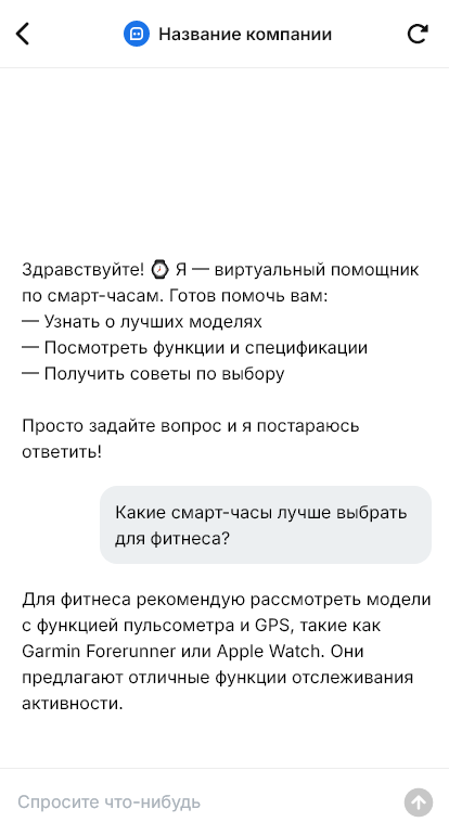 Внедрение настраивается под ассортимент и бизнес-процессы магазина: модели, варианты ремешков, наличие, гарантия, рассрочка, доставка, возвраты, интеграция с CRM. Бот может показывать сравнения «по задаче», а не по длинному списку характеристик, что повышает качество выбора.