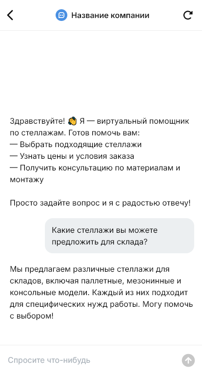 Стеллажи часто покупают под конкретные параметры: высота, ширина, глубина, нагрузка, количество секций, тип склада или магазина. Клиенты пишут в мессенджеры и ждут быстрый подбор. Если ответа нет, уходят к другим поставщикам. Бот для стеллажей помогает автоматизировать первичную консультацию и сбор данных для расчёта.