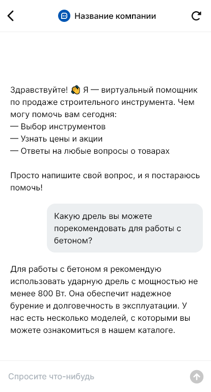 Строительный инструмент покупают и профессионалы, и частные мастера, но почти всегда под конкретную задачу и сроки. Клиенту нужно быстро понять, какой перфоратор, миксер, штроборез, уровень или плиткорез подойдет, какие расходники нужны и как не переплатить. В магазине инструмента много похожих моделей, и без нормальной консультации покупатель либо уходит, либо берет не то и возвращается с претензией. При онлайн запросах проблема усиливается, потому что в переписке сложно быстро собрать вводные.