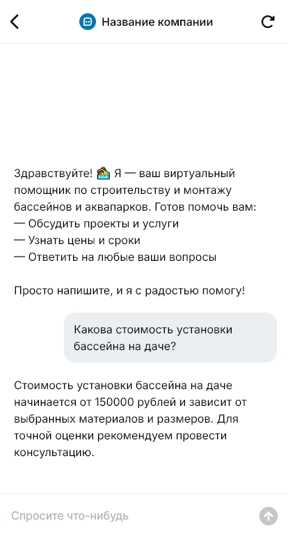В итоге строительство бассейнов и аквапарков становится более управляемым. Бот работает в Telegram, VK, MAX и на сайте, повышает качество входящих запросов, ускоряет подготовку коммерческого предложения и помогает довести клиента до ввода объекта в эксплуатацию и регулярного обслуживания.