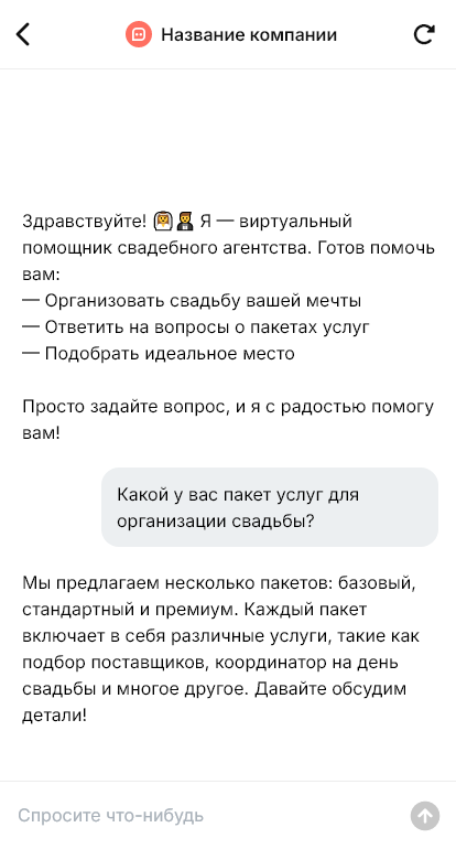 Внедрение настраивается под процессы агентства: пакеты услуг, сроки подготовки, правила бронирования, предоплата, список проверенных подрядчиков, этапы согласования, интеграция с CRM. Бот помогает объяснить путь: бриф → концепция → смета → договор → подготовка → день свадьбы.