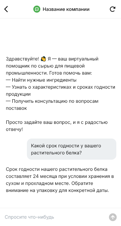 Бот помогает собрать запрос структурированно и без лишних созвонов. Он уточняет категорию сырья, ключевые показатели, объём и фасовку, требования к документам, регион и сроки поставки, тип транспорта и контакт ответственного. При необходимости бот принимает спецификацию файлом, фиксирует заявку и отправляет подтверждение со статусом. Это ускоряет подготовку расчёта и снижает риск ошибок в параметрах.