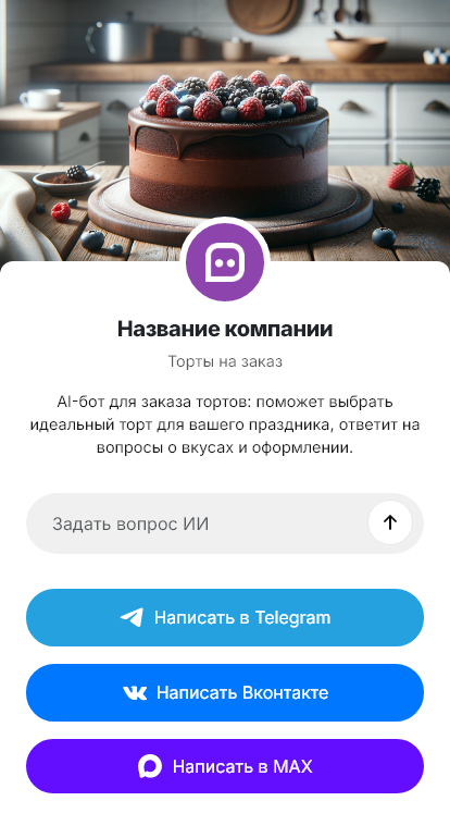 В итоге кондитерская получает больше подтверждённых заказов и меньше потерь из‑за недосказанности. Бот работает в Telegram, VK, MAX и на сайте, превращая первые вопросы в чёткое ТЗ и заказ с конкретной датой.