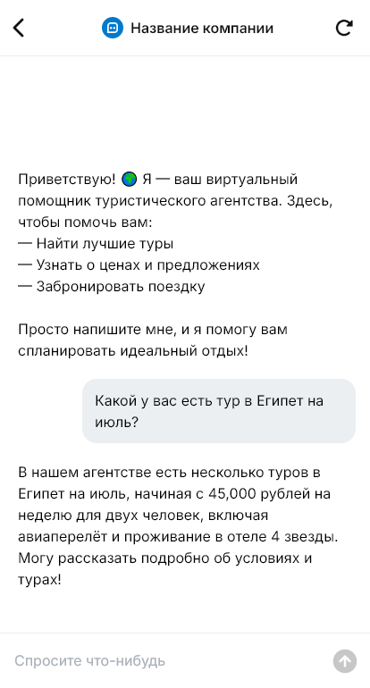 Внедрение настраивается под агентство: направления, типовые пакеты, правила оплаты и возвратов, интеграция с CRM и каналами связи, сценарии для разных типов клиентов. Бот может сопровождать клиента после покупки: отправлять документы, напоминать о вылете, трансфере, чек-лист поездки.