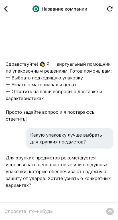 Чат-бот уточняет, что нужно: коробки, пакеты, плёнка, скотч, стрейч, гофротара, наполнители, стреп-лента и т.д. Далее бот собирает технические параметры: размеры, плотность/толщина, назначение (пищевое/непищевое), требования по прочности и хранению, объём партии, сроки и адрес доставки. Если нужна печать — бот уточняет макет, цветность, тираж и вариант нанесения. По сценарию бот принимает спецификацию или список позиций и помогает собрать комплект под задачу (например, «на отправки маркетплейсов»).