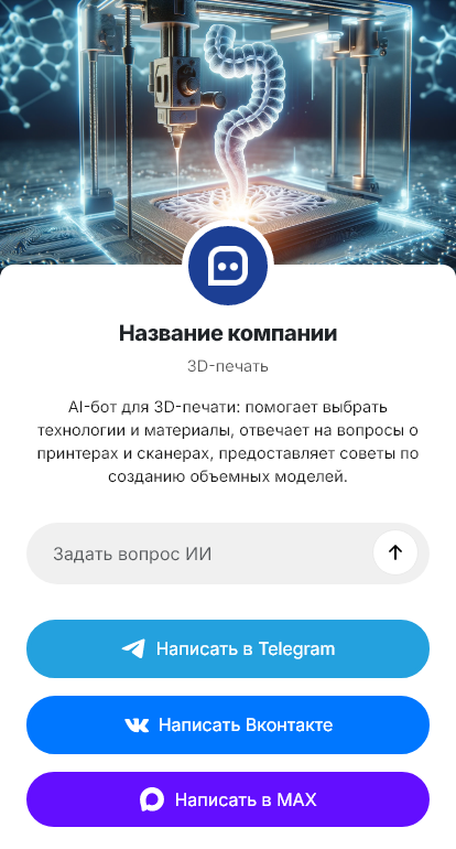 Внедрение настраивается под оборудование и технологии компании: FDM, SLA, SLS, постобработка, покраска, сборка, контроль качества, сроки производства, стоимость за грамм/час, интеграция с CRM. Бот помогает быстро формировать заявку и передавать её инженеру уже с ключевыми параметрами.
