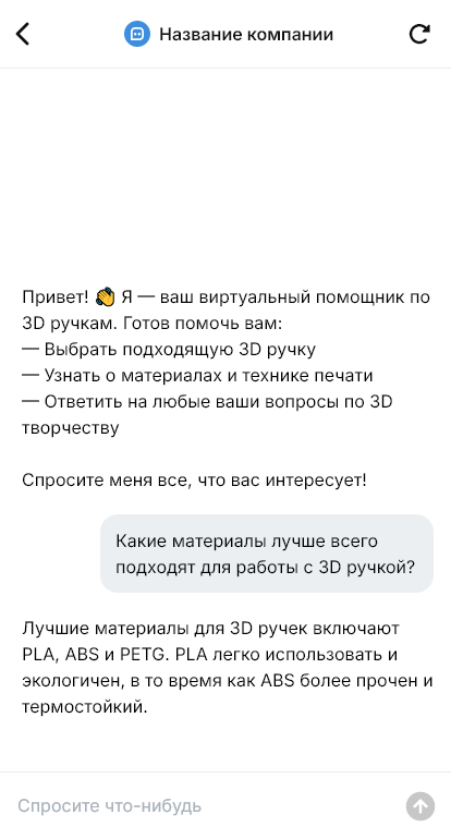 Внедрение настраивается под ваш ассортимент: модели, комплекты, расходники, наборы для творчества, доставка и гарантия, интеграция с CRM и оплатой. Бот может напоминать о расходниках и предлагать наборы филамента под выбранные проекты.