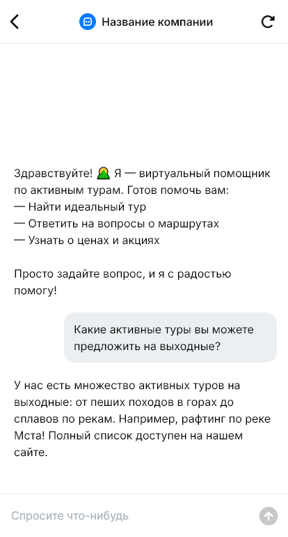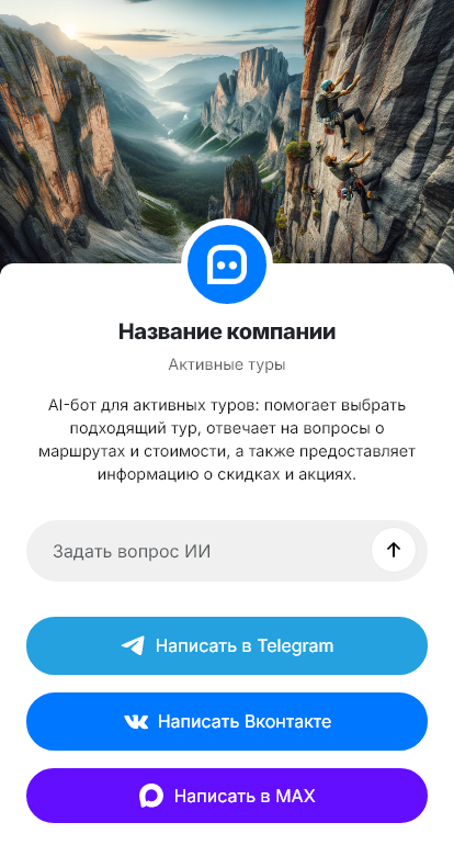 Внедрение настраивается под туроператора: программа каждого тура, шкала сложности, условия, правила оплаты, интеграция с CRM. Бот помогает оформить участие, собрать данные и напоминать о подготовке, снижая вероятность «передумал» перед поездкой.