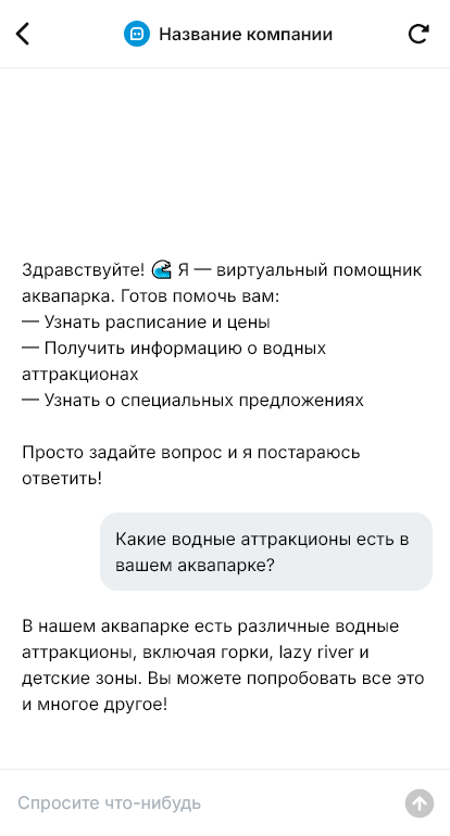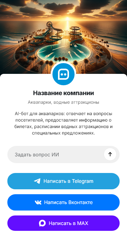 Внедрение настраивается под инфраструктуру аквапарка: тарифы, акции, расписание, ограничения по аттракционам, правила безопасности, групповые посещения и дни рождения, интеграция с кассой/CRM. Бот помогает снижать нагрузку на колл-центр и собирать контакты для рассылок и повторных визитов.