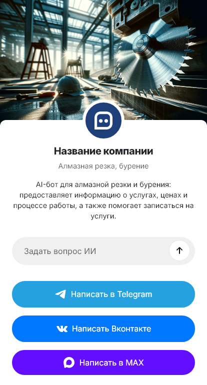 В итоге резка и бурение продаются стабильнее, а клиенты получают быстрый ответ и точный расчёт. Бот работает в Telegram, VK, MAX и на сайте, превращая вопросы в заявки на выезд и договор.