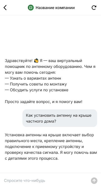 Бот помогает собрать данные и подготовить монтаж правильно. Он уточняет адрес, тип объекта (квартира, дом, офис), что именно нужно (эфирное ТВ, усиление сигнала, интернет через антенну и т.д.), какие симптомы сейчас, где планируется установка, есть ли доступ на крышу, как проложен кабель, нужна ли мачта, и когда удобно принять мастера. Бот может попросить фото места установки и текущего оборудования, чтобы заранее оценить сложность.