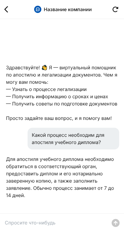 Внедрение настраивается под процессы компании: маршруты по ведомствам, сроки, стоимость по типам документов, правила работы с доверенностями, доставка, оплата, интеграция с CRM. Бот фиксирует статус — принят, в работе, на заверении, готов — и уведомляет клиента, снижая количество тревожных уточнений.