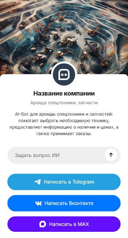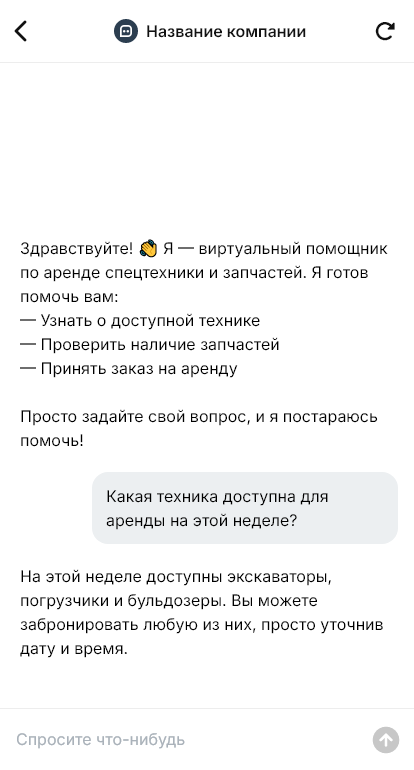 Внедрение настраивается под ваш бизнес: парк техники, каталог запчастей, тарифы, сроки поставки, интеграция с CRM и диспетчеризацией. Бот может выдавать ориентир по цене, бронировать смену, формировать заявки на подбор деталей, а также отправлять клиентам статусы и напоминания. Для постоянных клиентов бот упрощает повторные заявки, сохраняя типовые параметры объектов или техники.