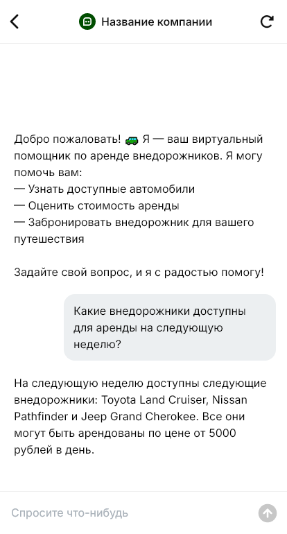 Аренда внедорожника продаётся увереннее когда бот уточняет условия поездки и подбирает вариант под реальный маршрут