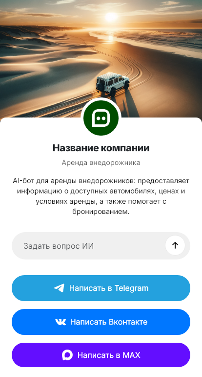 Бот для аренды внедорожника помогает быстро собрать параметры поездки и подобрать подходящий вариант. Он уточняет даты аренды, маршрут и тип дорог, количество пассажиров и багаж, нужен ли багажник, детское кресло, требования к комплектации, бюджет, опыт водителя, предпочтение по классу и брендам. Бот объясняет условия: пробег, залог, страховка, правила выдачи, и предлагает оформить бронирование, фиксируя контактные данные.