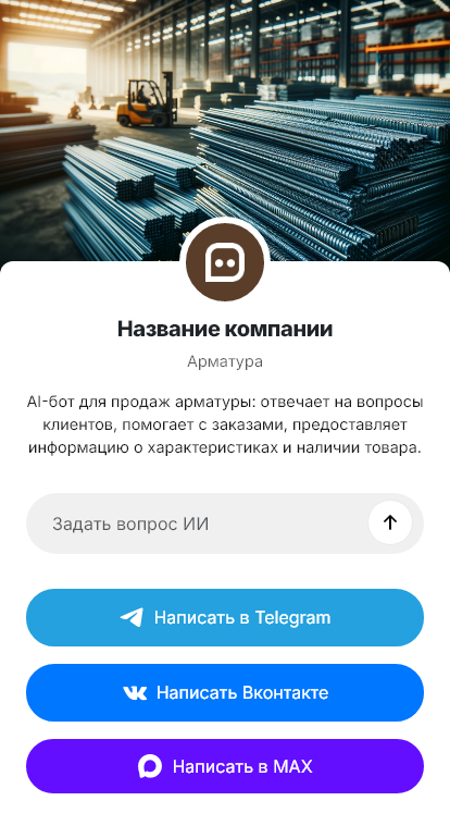В итоге арматура продаётся стабильнее, а клиенты быстрее получают расчёт и условия поставки. Бот работает в Telegram, VK, MAX и на сайте, превращая вопросы о цене в оформленные заявки.