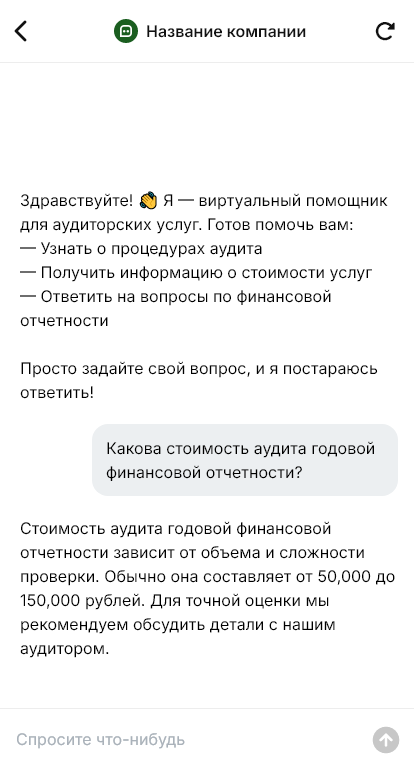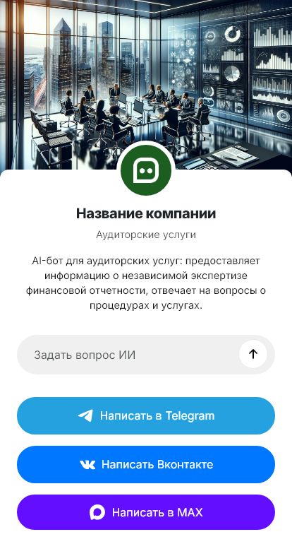 Внедрение учитывает процессы аудиторской компании: виды услуг, требования к документам, сроки подготовки договора, режим конфиденциальности, взаимодействие с бухгалтерией клиента, интеграция с CRM. Бот помогает сразу задать правильные ожидания: какие данные нужны, как проходит аудит, какие этапы и сроки.