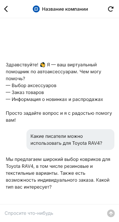 Покупатели автоаксессуаров приходят с конкретной потребностью, но часто не могут быстро выбрать подходящий вариант: коврики должны совпасть по модели и кузову, крепления багажника — по рейлингам, щётки — по длине и типу крепления, держатели — по форм-фактору салона, а мелкие детали вроде клипс и крепежа — по размеру. В офлайне это решается консультацией продавца, но в мессенджерах и на сайте такой диалог легко превращается в длинную переписку, где часть клиентов теряется.
