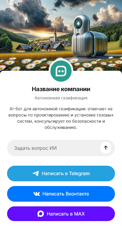 Бот работает в Telegram, ВК, MAX и на сайте 24/7, повышает скорость ответа и конверсию обращений в реальные выезды и договоры по автономной газификации.